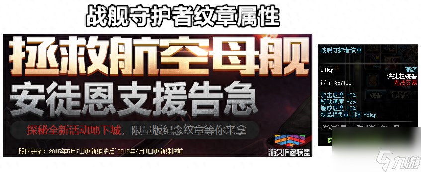 而在七周年盛世狂欢的前几天,通过拯救航空母舰的活动也能获得一个免费的战舰守护者纹章,纹章的属性同样渣渣,只有三速+2%和负重上限+5kg,但这个纹章同样可以通过使用金币修理来补充能量!