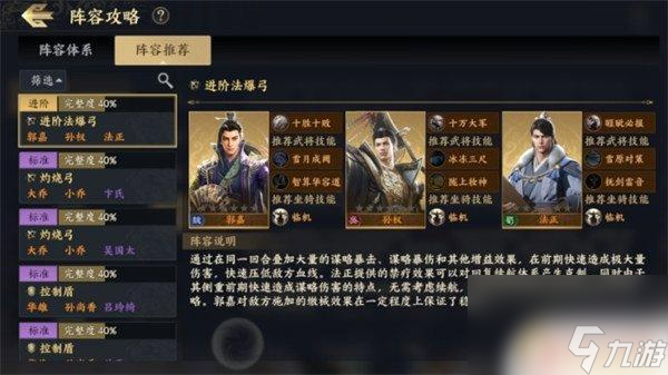 法爆体系克制连击,追求前期的最大输出。在同一回合叠加状态效果、释放大量伤害技能(例如郭嘉降低敌方谋略防御,法正增加己方谋略暴击与暴伤,配合孙权或司马懿的谋略伤害爆发),可以携带前期收益较高的技能进一步强化前期输出(例如【冰冻三尺】、【陇上妆神】),快速压低敌方血线,但需要注意的是,如果面对高减伤、高回复的敌军队伍会较比较难取得优势。