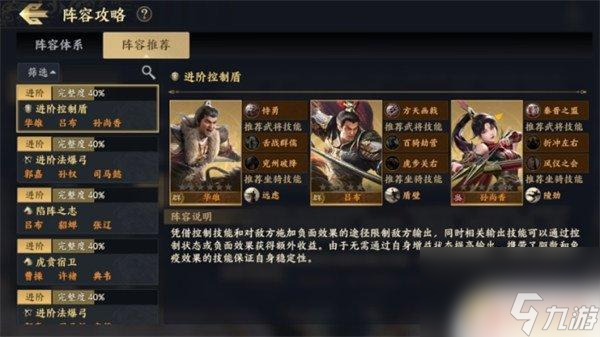 控制盾体系克制携带大量主动技能的队伍,通过控制和减益效果限制敌方输出(例如甘宁的眩晕、吕布的沉默、周泰的沉默与减伤),同时以技能连携效果造成每个回合平稳的伤害。
