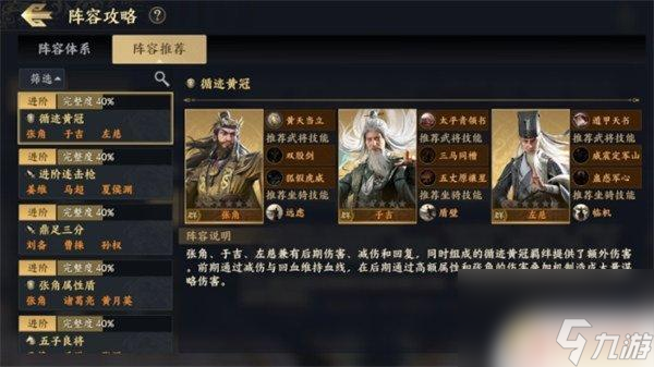 法盾与骑坦的思路类似,同样克制控制。前期承受伤害保持血线(例如于吉与左慈的组合),后期造成逐渐升高的谋略伤害,值得一提的是,张角的【黄天当立】拥有伤害逐渐叠加的独特技能机制,在法盾体系中可以产生极佳的效果。
