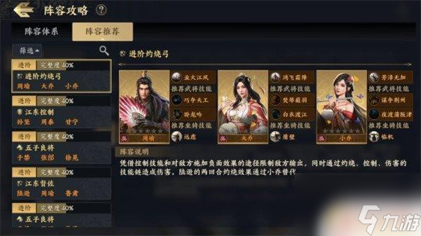 灼烧弓与控制体系思路类似,在控制、减益状态限制敌方输出的基础上(例如周瑜的缴械,鲁肃的降低敌方攻击减益效果),通过灼烧技能造成百分比伤害(例如小乔、陆逊的灼烧),在面对高血量敌军时会有较高的收益。