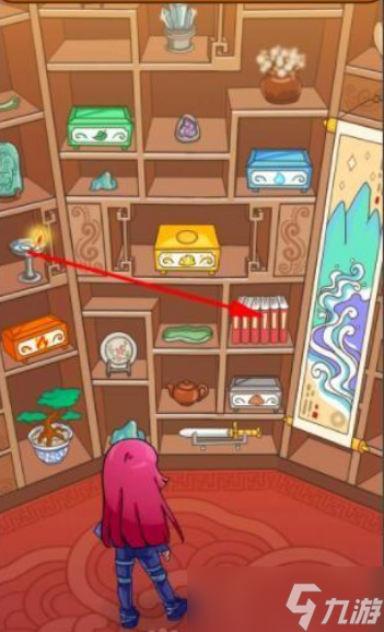 找齐其他物品后,拖动烛台烧毁山水画上的星星与铜钱。
