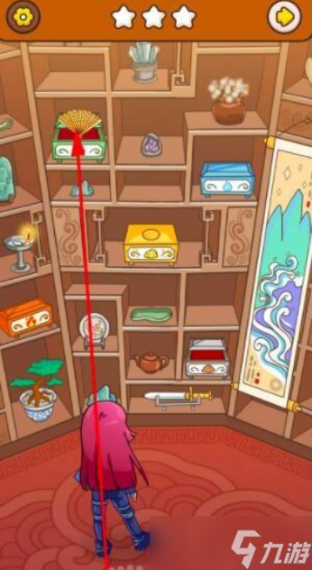 拖动宝剑到盆栽上。砍掉一片树叶,将树叶拖动到叶子标志的盒子上。盒子打开,点击拾取扇子。