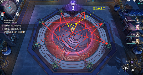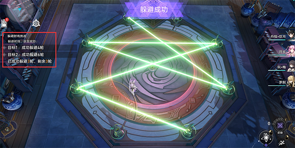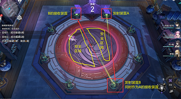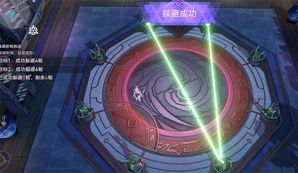 准备期过后,射线就会激活,如果此时角色战在射线经过的位置上就代表本轮失败,若站在安全区则本轮成功。