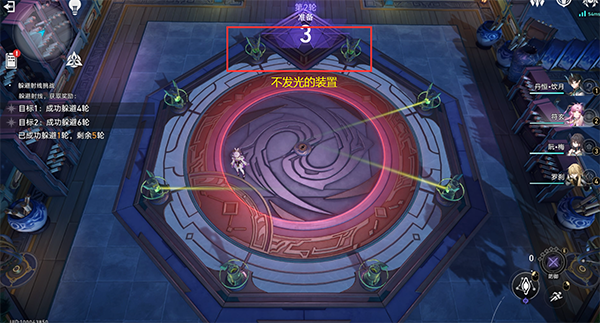 每一轮射线,我们都会有3秒准备期,此时发射装置会发出一段较短的绿色光线,接收装置会亮起。我们需要通过观察和预判,来操控角色移动到安全位置。