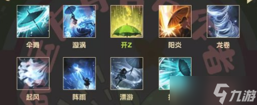 连招顺序:伞舞、漩涡、开z、阳炎、龙卷、起风、阵雨、漂游、撑伞