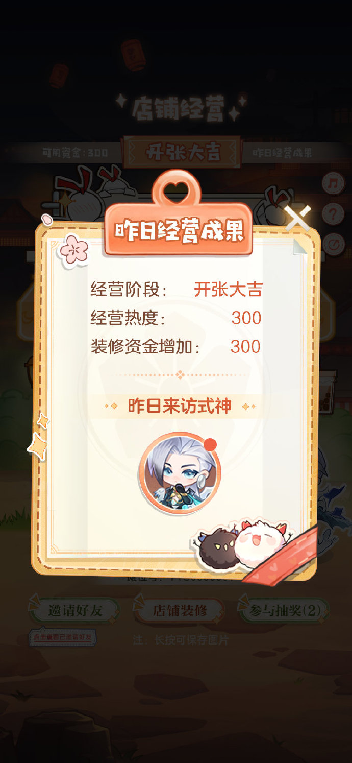 ※店铺共有「开张大吉」、「蒸蒸日上」、「红红火火」三个经营阶段。初步装修完成后可解锁「开张大吉」阶段,次日将结算前一天的经营热度,并解锁下一个阶段。解锁「红红火火」阶段后,大人将免费获得所有店铺饰品。