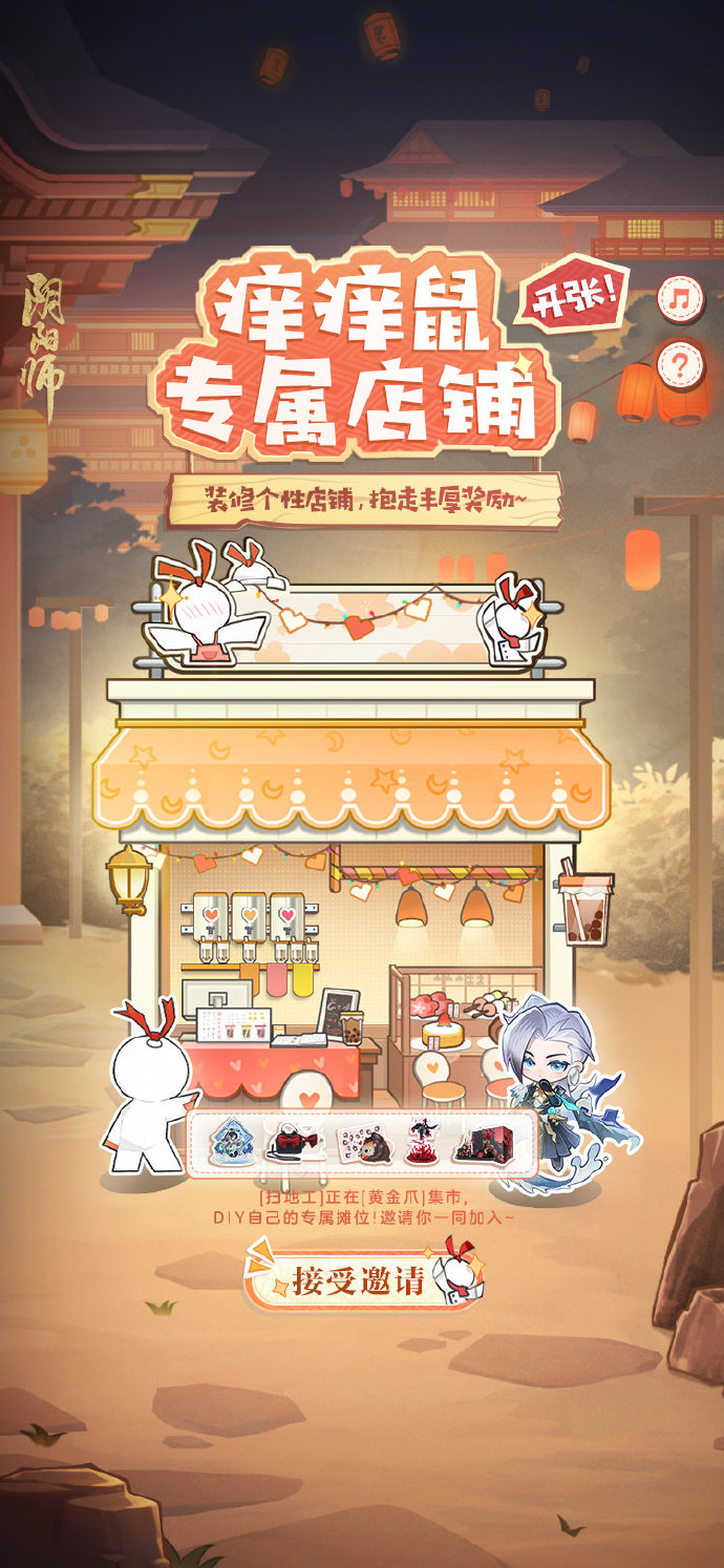 即日起,前往阴阳师手游超话 中带话题 #痒痒鼠摊位DIY# 发帖分享大人的店铺装修截图,扫地工将从中抽选 10 位参与本次活动的大人送出【神秘周边礼包】*1(截至1月17日23:59)
