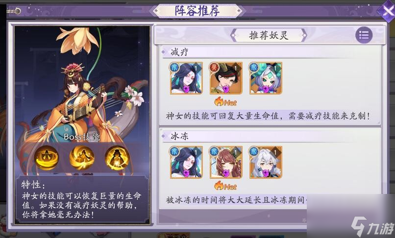 神女会不断回复自己的生命,所以需要我方妖灵有给神女上减疗debuff的能力,同时冰冻对神女也有特攻。所以推荐腾蛇,毕方,魔眼,洛神,河伯这些妖灵上阵。