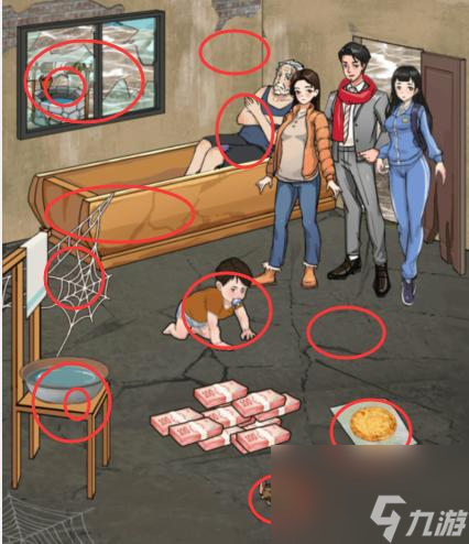 3、然后拖动钱到下图所示位置,窗户改变后向右滑动,拖动钱到水井,水盆变化后,拖动钱到鲨鱼的牙齿