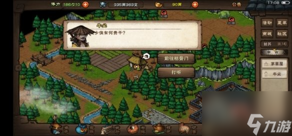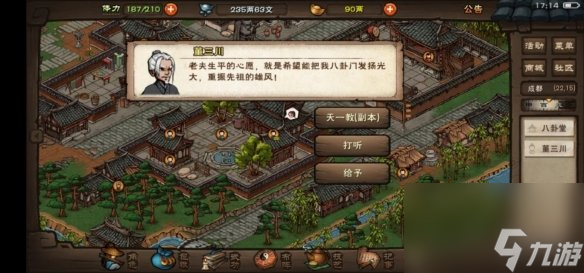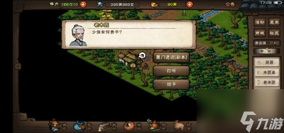 (2) 南阳渡药铺打工:前提是你学会了炼丹术。你可以向老郎中打听炼丹术,并支付50文钱来学习。当你的银两低于20两时,你可以开始打工,每天可赚取3两银子的收入。这对于游戏前期来说是一笔可观的收入。
