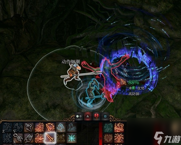 进入战斗先别急,在高地上的人是不会进入战斗的可以白嫖永一个动作,我这里法师白嫖一个匕首云然后战士动作如潮四连摔绊攻击就是天王老子来了也别想跑,倒在匕首云里还可以造成巨额输出。