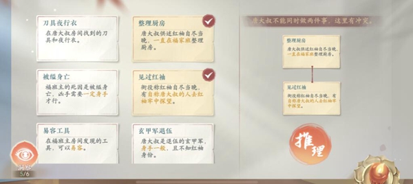 二、刀具夜行衣指的是从唐大叔房间内发现的刀具与夜间衣物,整理厨房则表示唐大叔陈述红袖自尽当晚,一直在福家班整理厨房,被缢身亡揭示了福班主是因被绞杀而死亡,凶手需具备良好的身手,见过红袖表示县衙衙役证实红袖自尽当晚,有自称唐大叔前往红袖牢房探视。