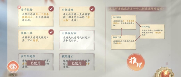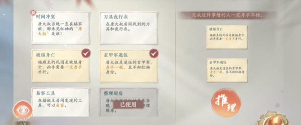 一、本任务推理的关键线索包括:刀具夜行衣、整理厨房、被缢身亡、见过红袖、易容工具、玄甲军退伍以及时间冲突等。