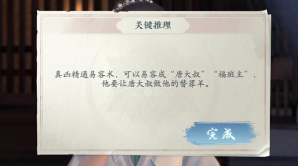 三、推理完成后得出结论:凶手精通易容之术,能够假扮为“唐大叔”“福班主”等角色,意图制造假象,使唐大叔承担罪责。