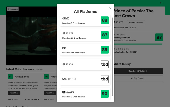 《波斯王子:失落的王冠》MC评分解禁,各平台85-90分之间,其中评分数量最多的 PS5版 87分,Nintendo Switch版 90分。