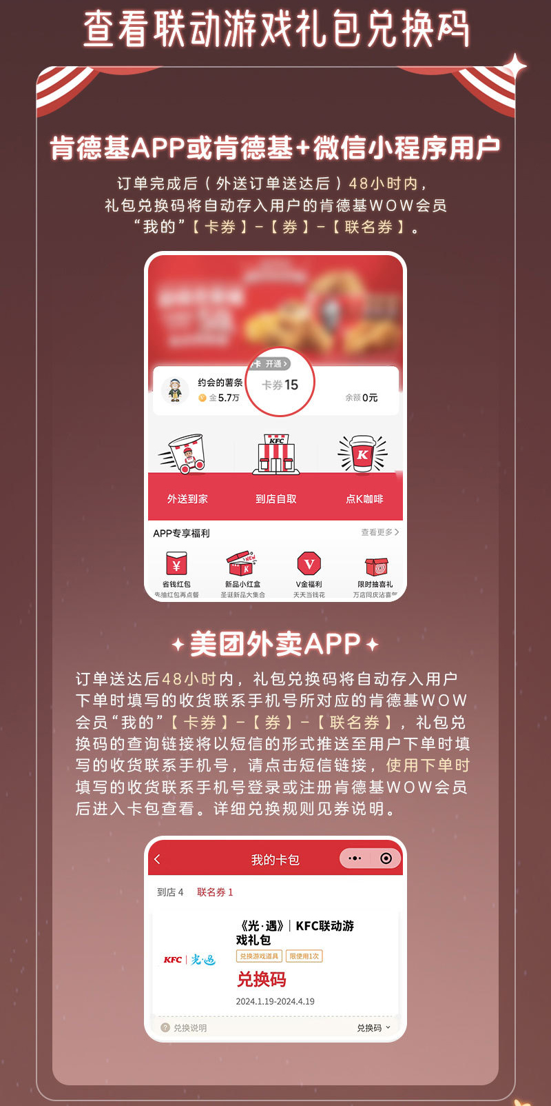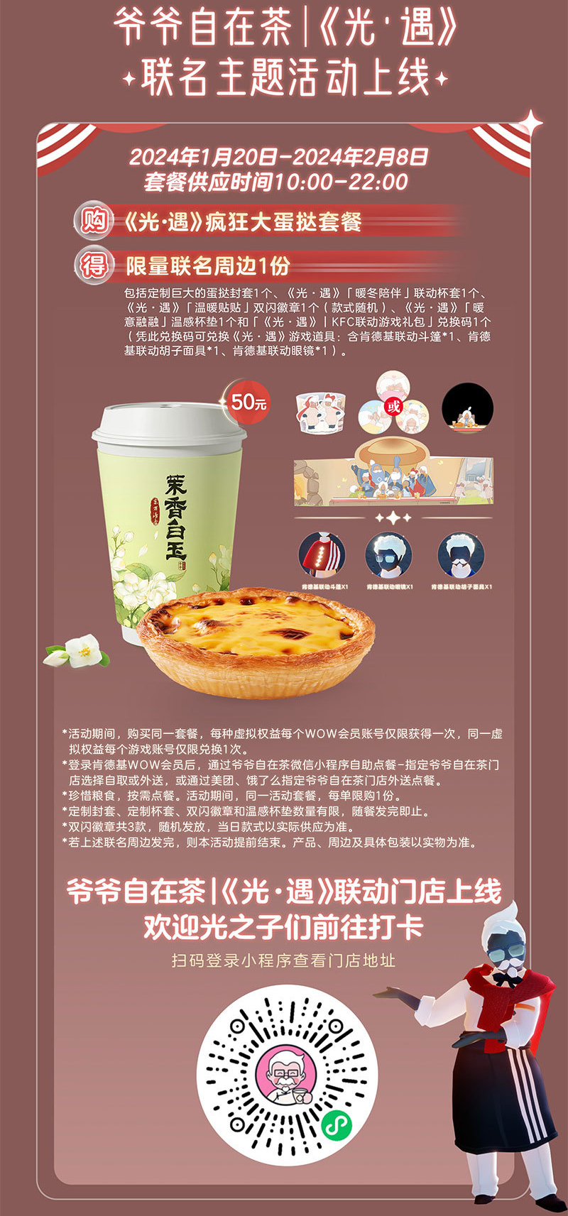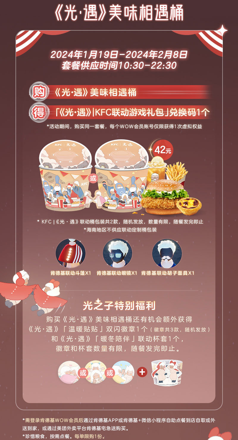 1月19日- -2月8日,在全国大部分地区肯德基餐厅可购买联动套餐,使用套餐附赠的兑换码,即可在游戏里获得肯德基联动斗篷、肯德基联动胡子面具、肯德基联动眼镜,详细内容请留意官方后续公告。