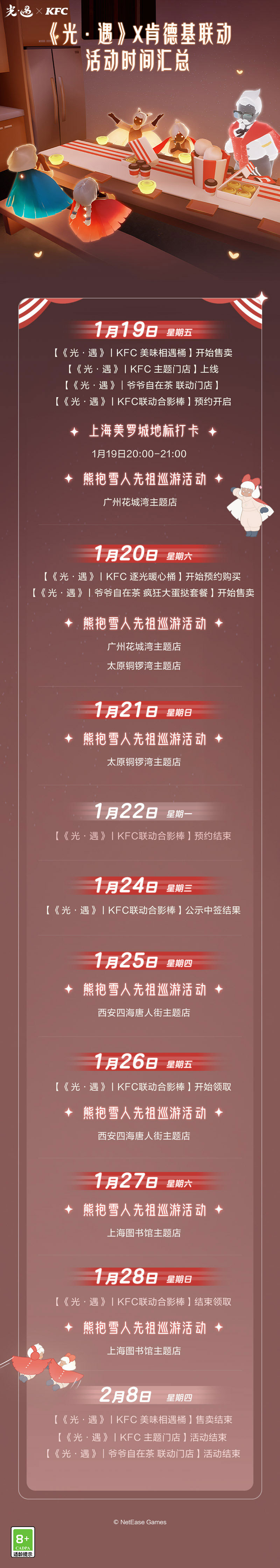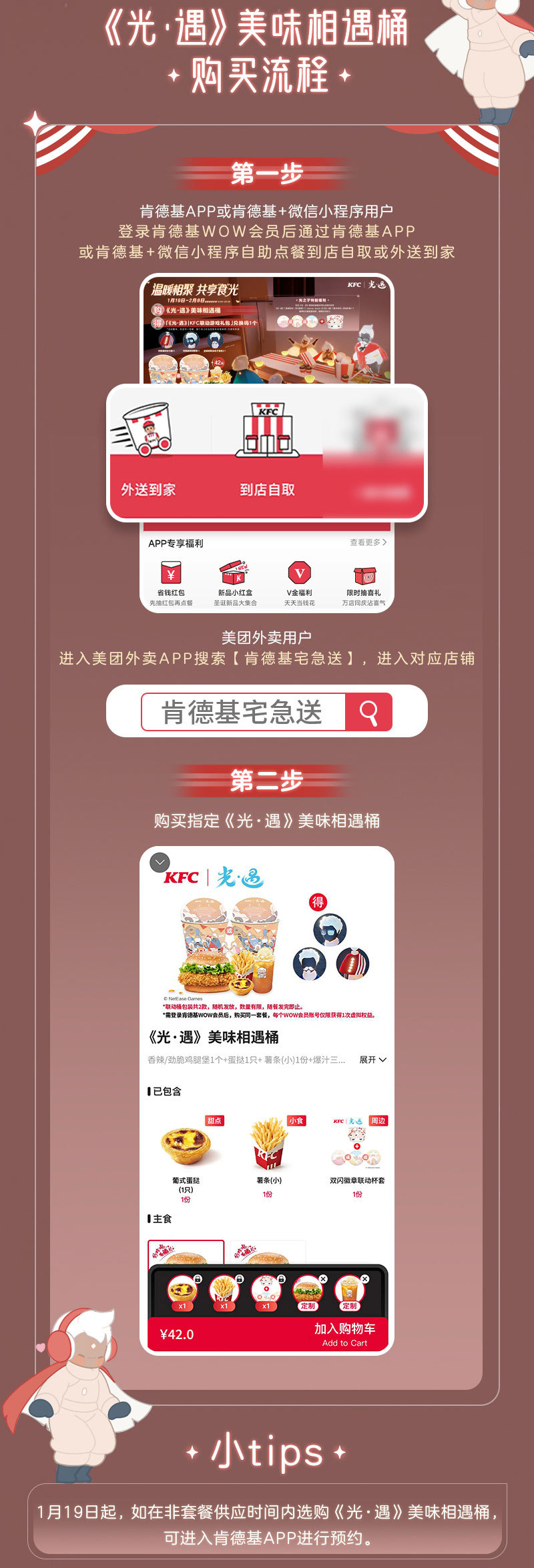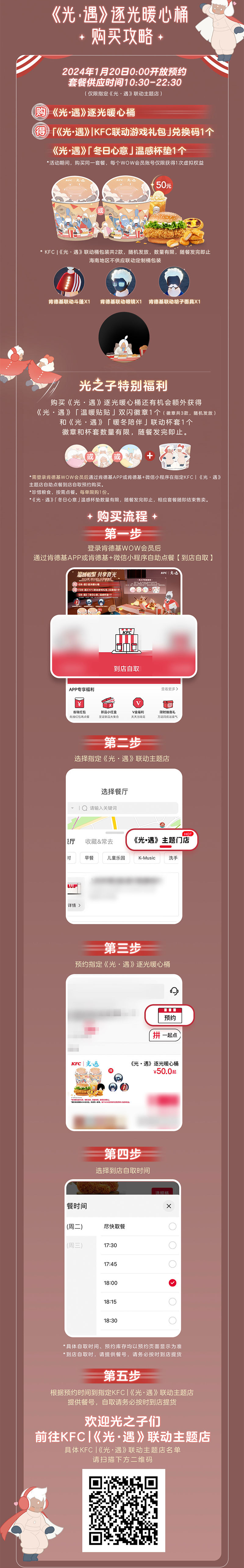 1月19日- -2月8日,在全国大部分地区肯德基餐厅可购买联动套餐,使用套餐附赠的兑换码,即可在游戏里获得肯德基联动斗篷、肯德基联动胡子面具、肯德基联动眼镜,详细内容请留意官方后续公告。