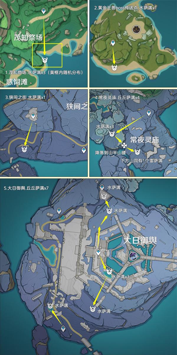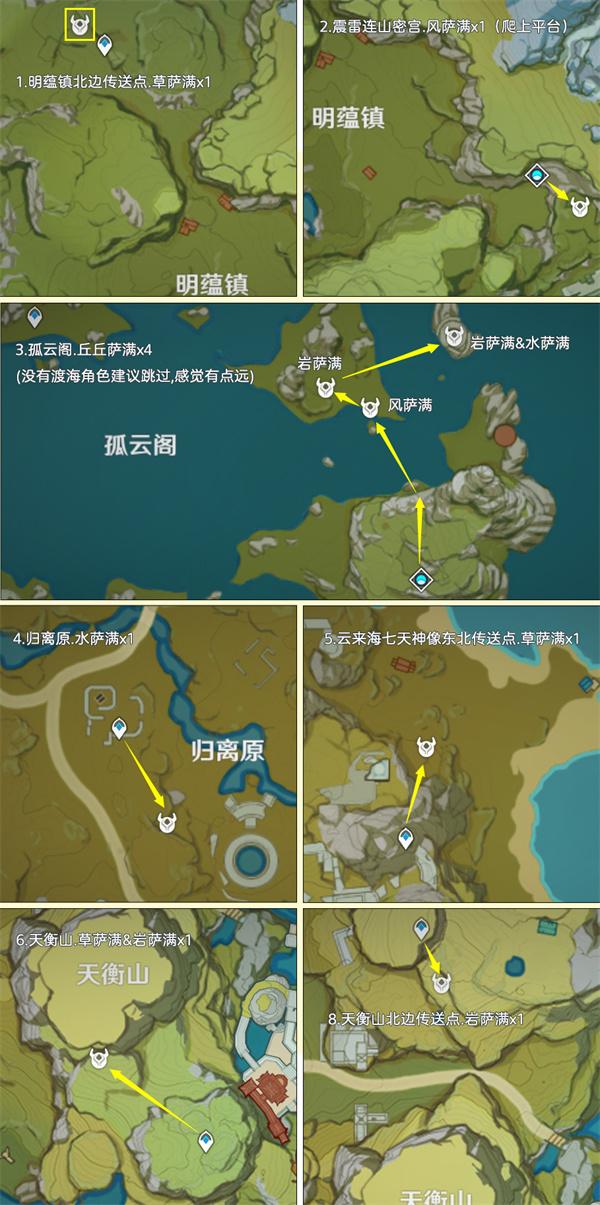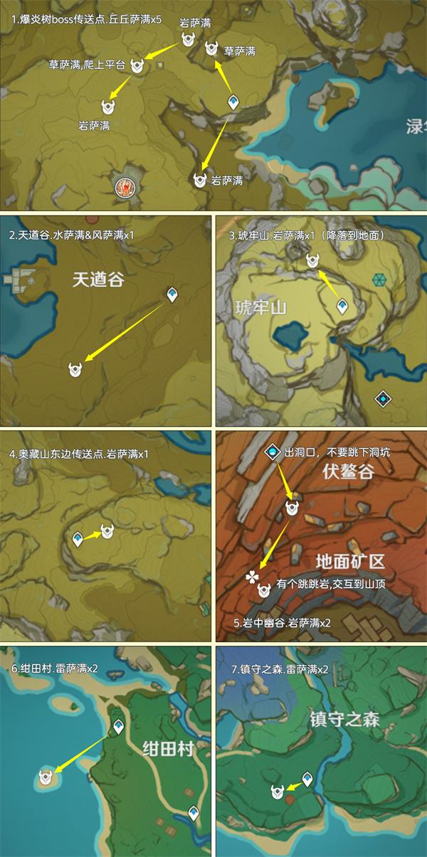 丘丘萨满目前广泛分布在提瓦特区域,其中优秀点位有风龙废墟、鹤观和渊下宫,全部点位加起来有只108个,其中地脉花点位有4个。