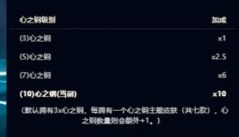1、拥有心之钢皮肤的召唤师将获得游戏对局层数加成:每拥有一个皮肤,心之钢数量+1。