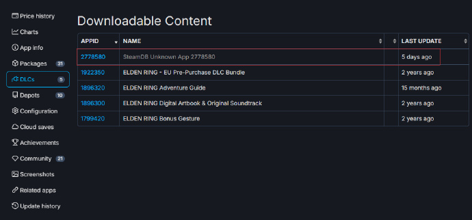 SteamDB后台显示,《艾尔登法环》在1月11日时添加了未公开的信息,并且被分类进了DLC类别中。