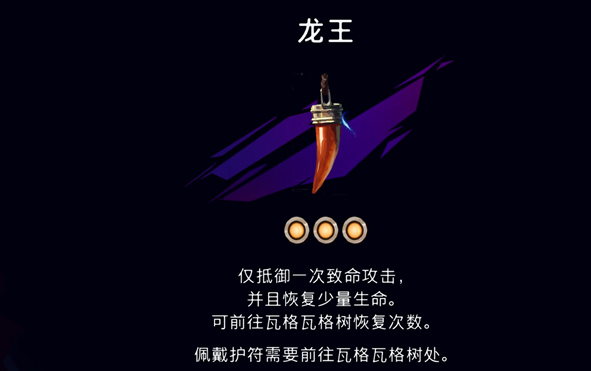 龙王护符的作用非常强悍,能够挡一次致命攻击,还能恢复部分血量,这个效果能提升很多容错,而且次数还能在瓦格瓦格树回复。