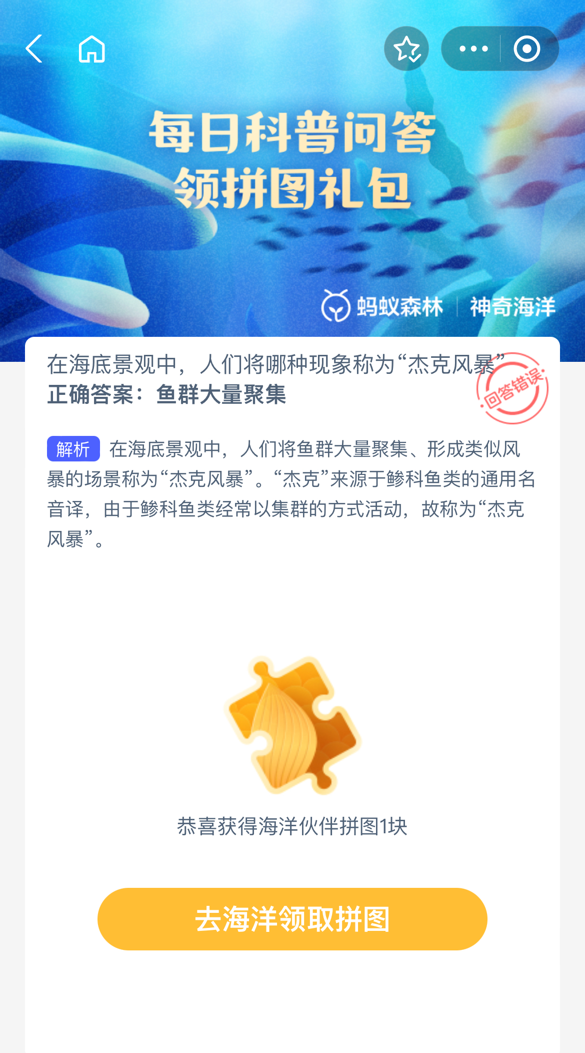 解析:在海底景观中,人们将鱼群大量聚集、形成类似风暴的场景称为“杰克风暴”。“杰克”来源于鲹科鱼类的通用名音译,由于鲹科鱼类经常以集群的方式活动,故称为“杰克风暴”。