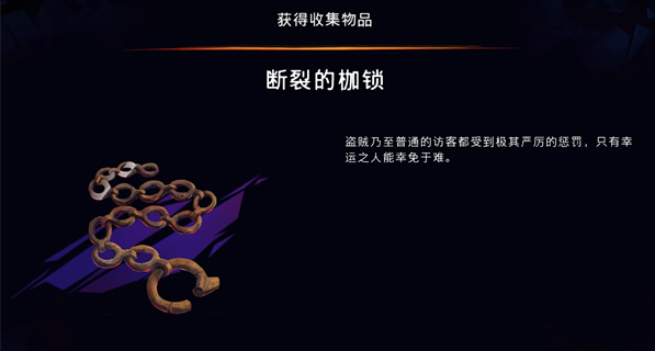 断裂的枷锁收集位置在囚牢里面,进入囚牢的方法就是在图腾图案房间的正上方第三个房间和BOSS对战,被武器抓住后丢进去。