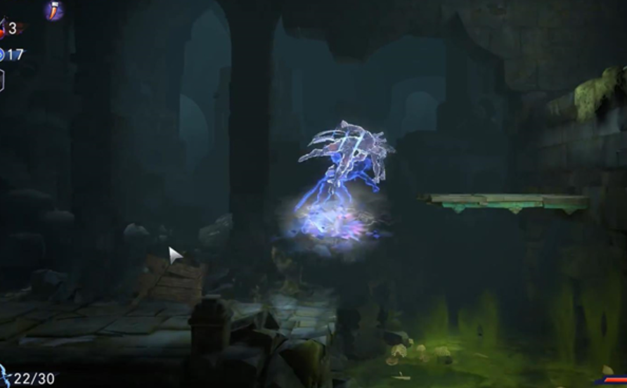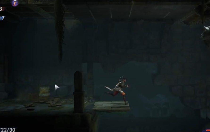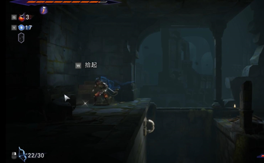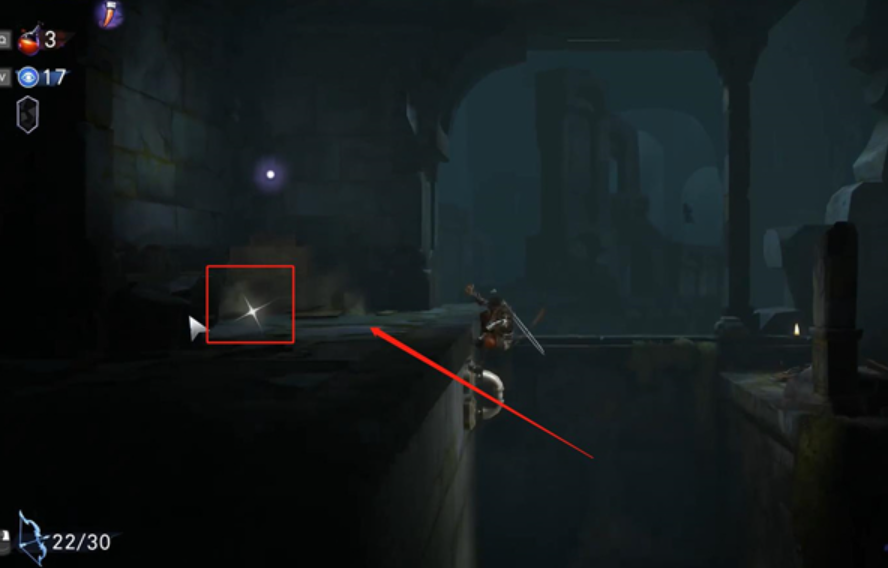 5、玩家需要从断口起跳,稍微下落一点接空中跳再接右冲,跑到右边的墙上,上下各有机关不要碰到。