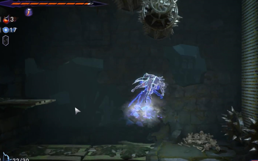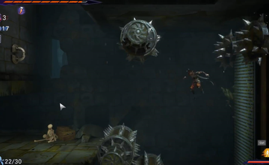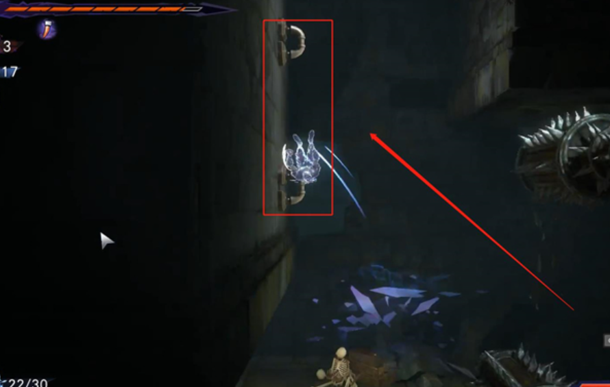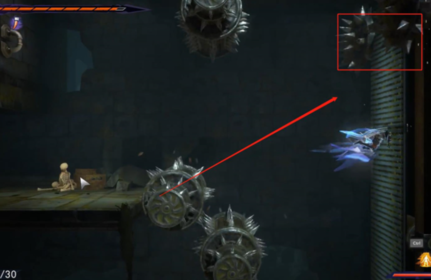 7、玩家需要在碰到机关之前往左边跳,从两个机关中间的缝隙穿过去。
