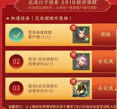2、加速任务内容为登录一次英雄联盟客户端、邀请一名玩家助力、邀请三名玩家助力。