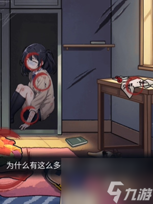 3、接着来到小美的房间,其中奇怪的地方分别是桌子上的之主画、凌乱的房间、点击打开柜子找到小妹小美惊恐的脸庞、手臂上的抓痕、带血的衣服。