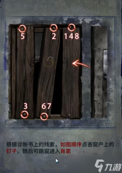 4、将小米喂给左侧纸扎鸡,获得诊断证书和蛋壳,按照下图顺序安装钉子然后就可以进入。