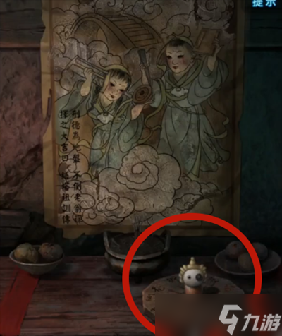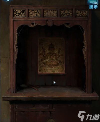 18、将金箔置入宅内空佛龛,获得缎布,返往左侧小屋,将缎布、热熨斗及时钟置上桌,依"2342"原则完成游戏,获取帛画。