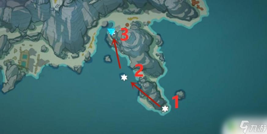 第二个漂流瓶位于一块礁石之上,由于角色在严寒天气中游泳会加快冷气的侵袭。所以这里推荐旅行者们携带凯亚、七七一类“渡海”角色前往拾取。