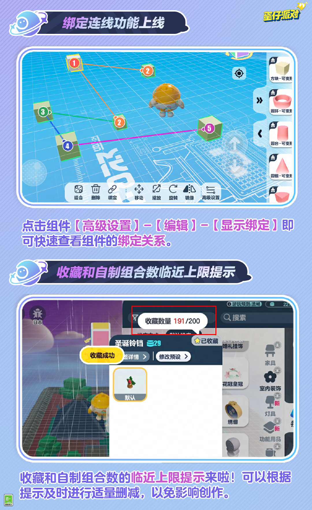 还有【场景管理】和【组件绑定连线】功能上线,收藏功能和自制组合数的临近上限提示来袭!