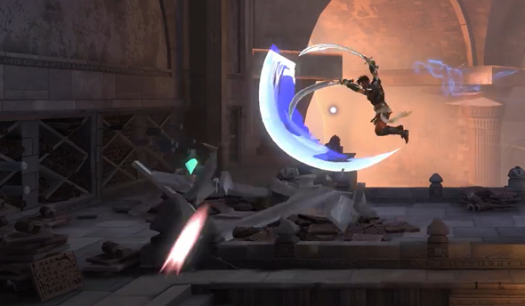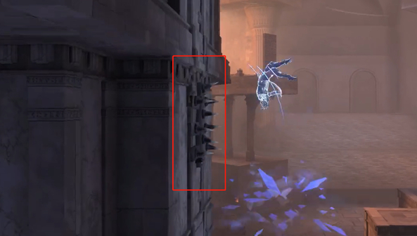 从右边的高处平台或者右侧墙壁弹射都是可以有办法上去的,毕竟把刺躲过去就能完事,上到左上角平台之后,立刻攻击这边的杂物堆。