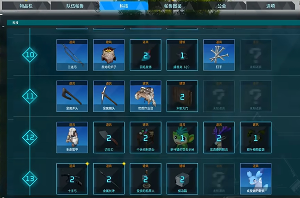 2、12级科技里有毛皮盔甲、切肉刀、中世纪制药台、新叶猿的突击步枪、紫霞鹿的鞍具和双叶植物套装。