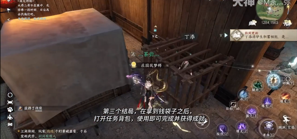 与丁添对话并选择“打听丧波消息”,然后打开任务背包把钱袋用了即可。