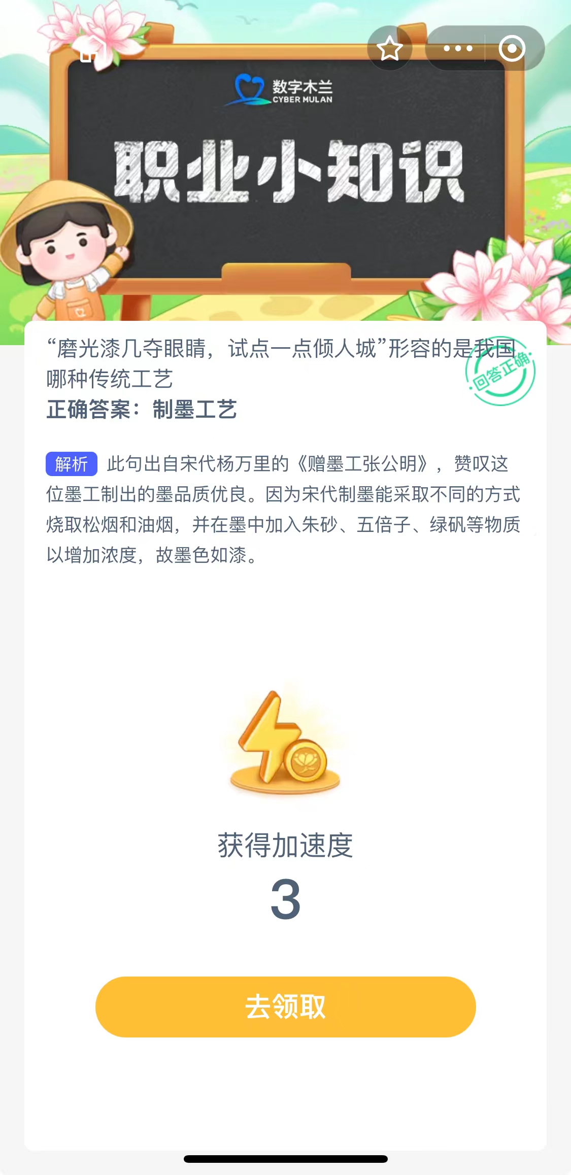 解析:此句出自宋代杨万里的《赠墨工张公明》,赞叹这位墨工制出的墨品质优良。因为宋代制墨能采取不同的方式烧取松烟和油烟,并在墨中加入朱砂、五倍子、绿矾等物质以增加浓度,故墨色如漆。