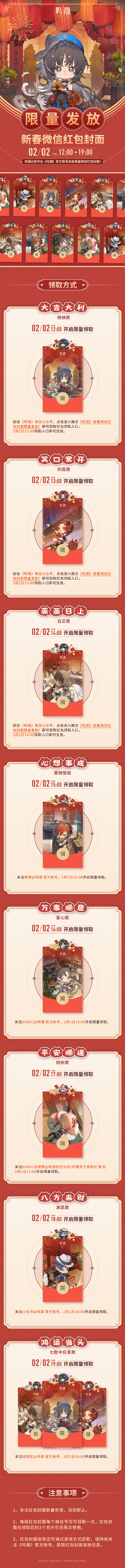方式二:关注@鸣潮 并转发本条内容,我们会抽取100位漂泊者送出《鸣潮》新春微信红包封面(随机款),截止至2月5日12:00。
