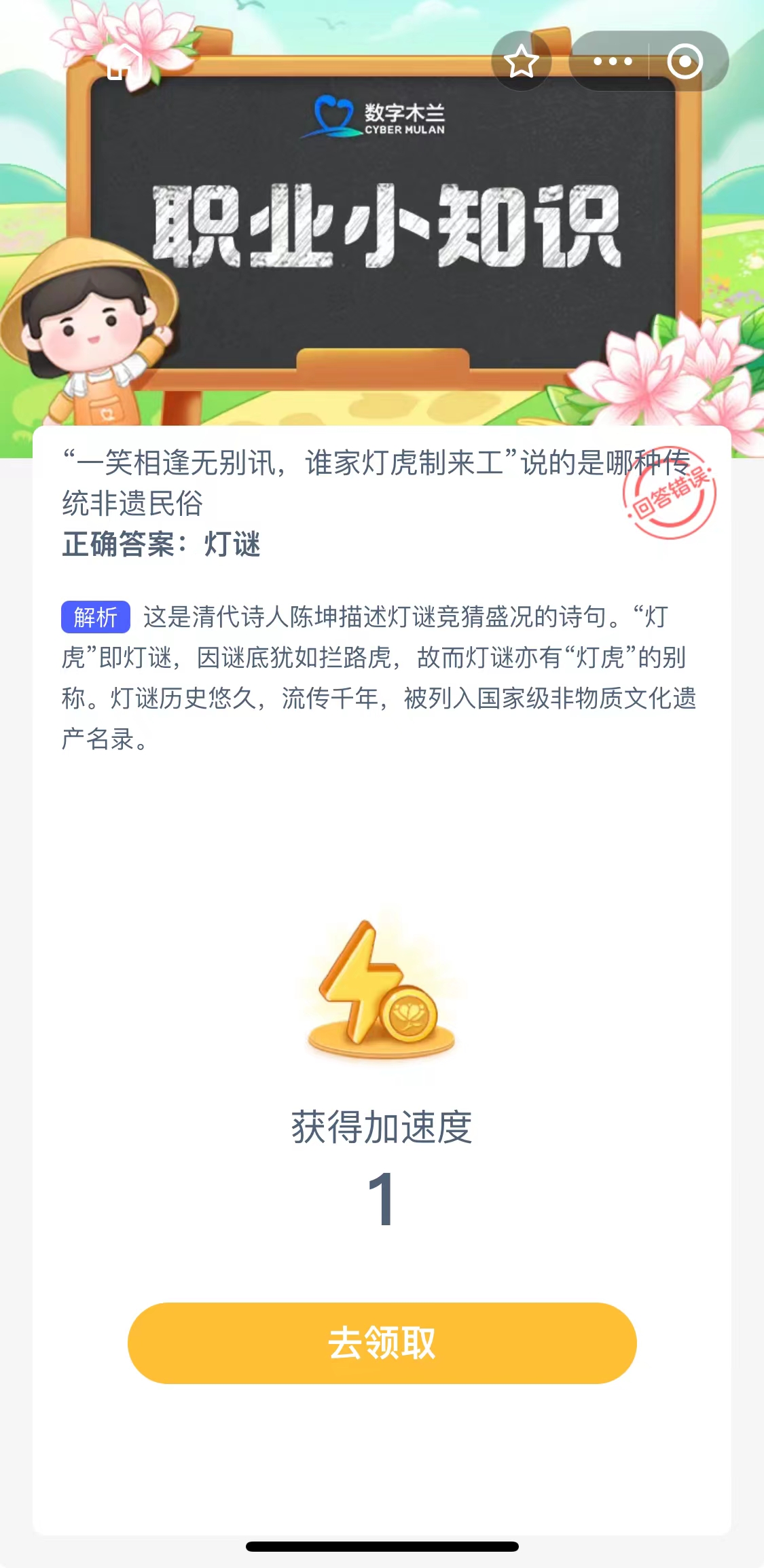 解析:这是清代诗人陈坤描述灯谜竞猜盛况的诗句。“灯虎”即灯谜,因谜底犹如拦路虎,故而灯谜亦有“灯虎”的别称。灯谜历史悠久,流传千年,被列入国家级非物质文化遗产名录。