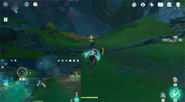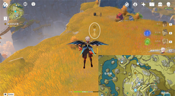 4、再往北方走,前往山顶,连按3次闲云战技,跳过悬崖,获得宝箱①。