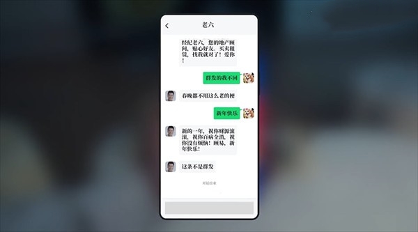6. 互动对话时,手机聊天内容均为等待画面,老六这里选择【群发信息接收不到】-【新年快乐】;