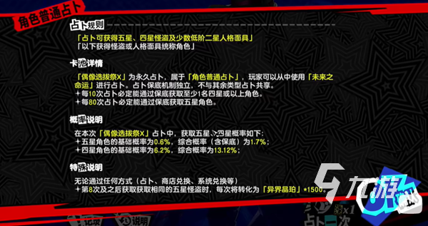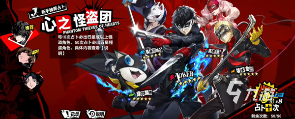 本作固定的保底是10次占卜必中四星或者是以上角色,而且累计50次可以必中一次五星怪盗角色,可以看到还是比较良心划算的,至少给了非酋一定抽到高品级角色的机会,不会说一直抽不到。