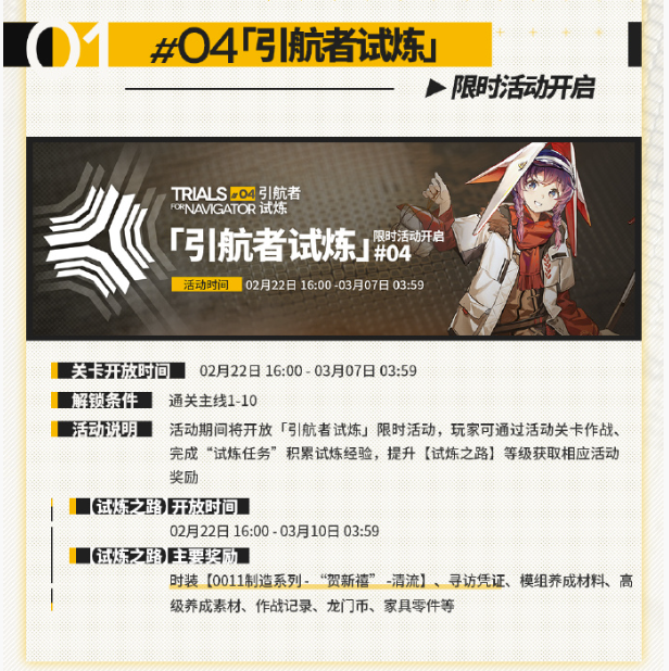 活动期间将开放「引航者试炼」限时活动,玩家可通过活动关卡作战、完成“试炼任务”积累试炼经验,提升【试炼之路]等级获取相应活动奖励