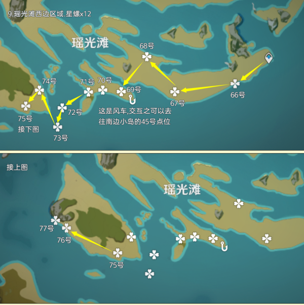 星螺点位分布在璃月海滩边,还有一小撮分布在龙脊雪山海域附近,其中可采集数量为77个,制作路线时尽量遵循从上往下游,视野高好看清,方便旅行者探索。