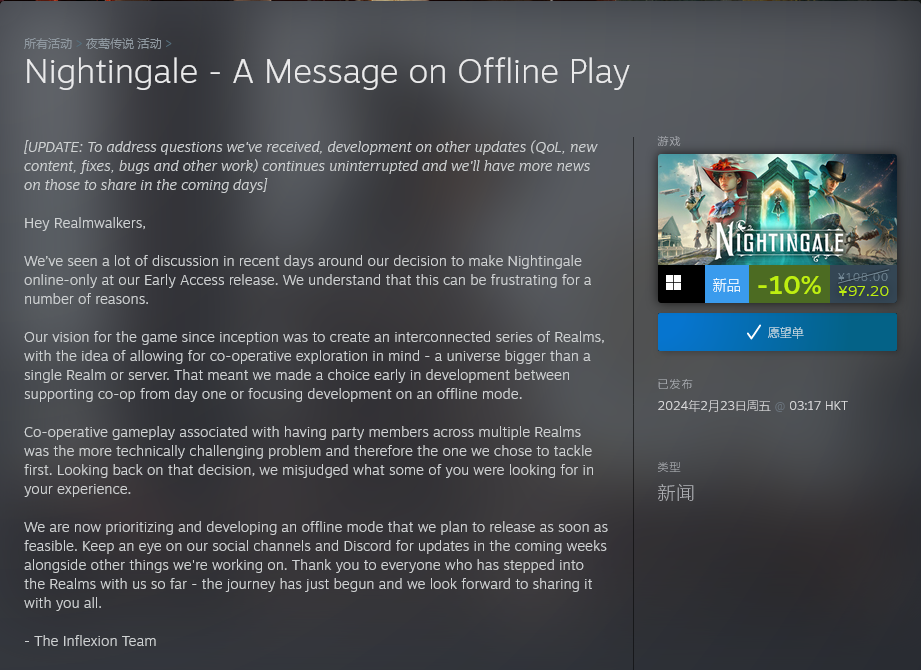 由 Infelxion Games 开发的生存游戏《夜莺传说》虽然发布后开局不错,但是因为其强制联网但同时存在大量服务器和技术性问题,它在 Steam 上的用户评价为“褒贬不一”。