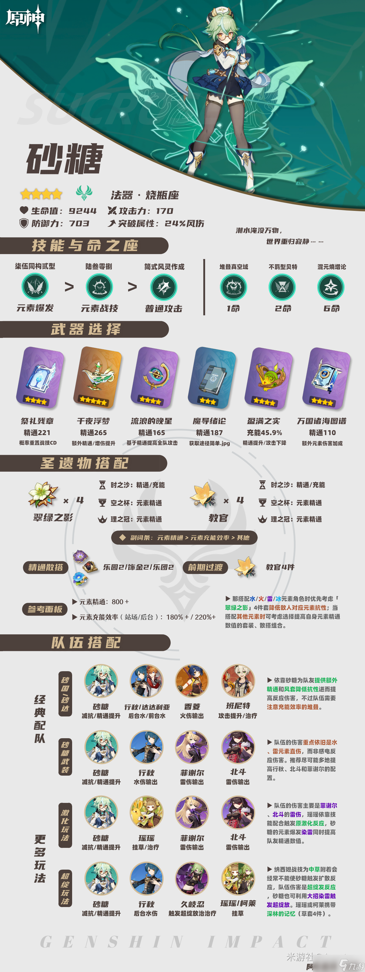 ⑤当前砂糖的配队主要是砂糖国家队、砂糖武装,在加入草元素角色后则可变阵出相关激化、绽放队伍供旅行者体验选择。(需要一定熟练度和角色练度)