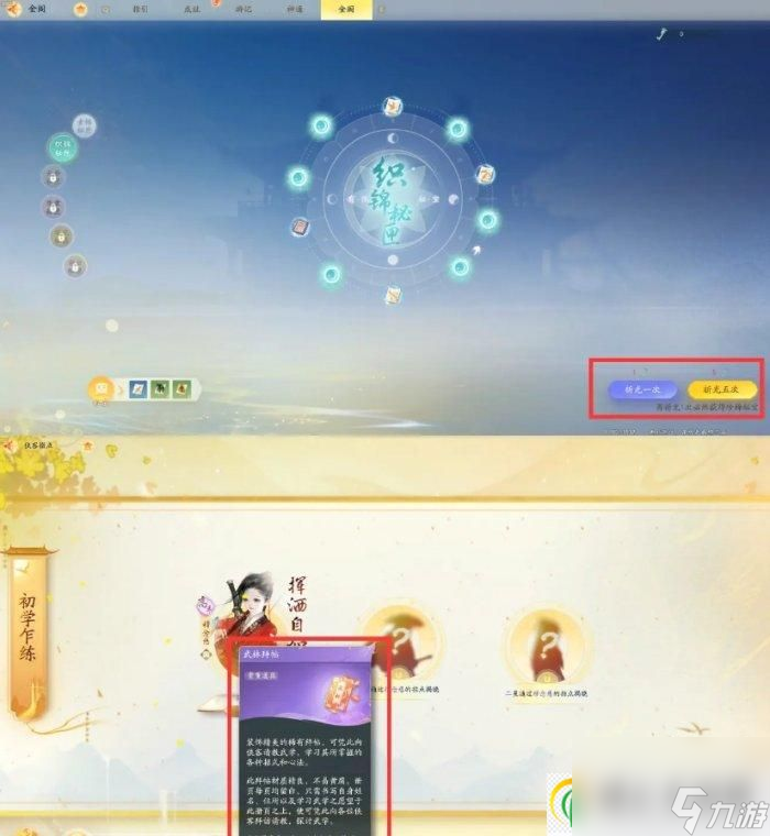 获取武学的途径有很多,前期我们主要依靠金阁“祈光“和“侠客指点”就行。后续我们还可以在副本/任务或是藏经阁中去学习武学。